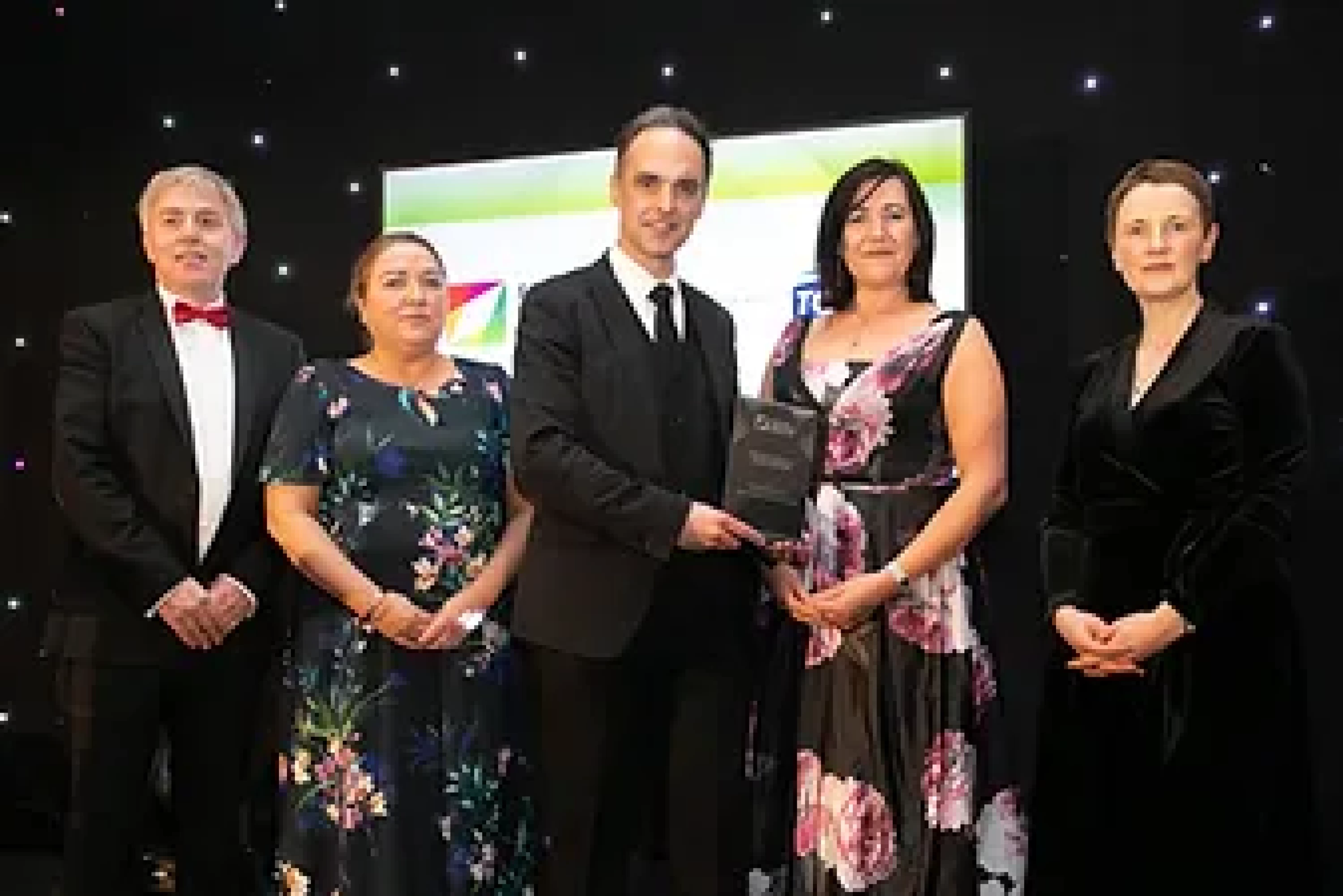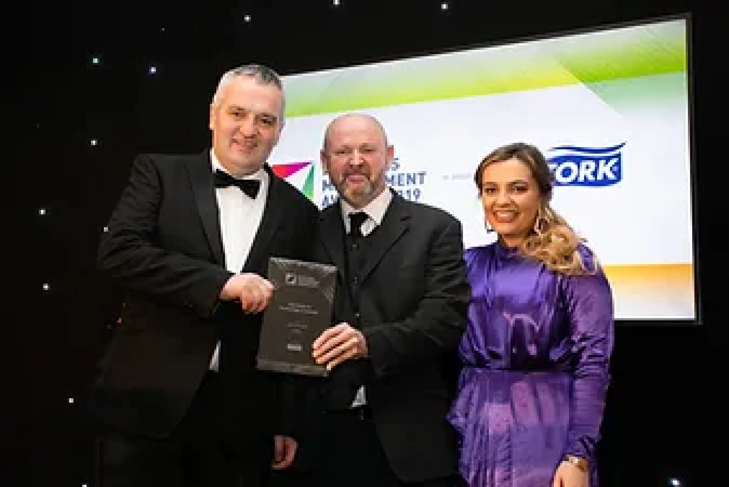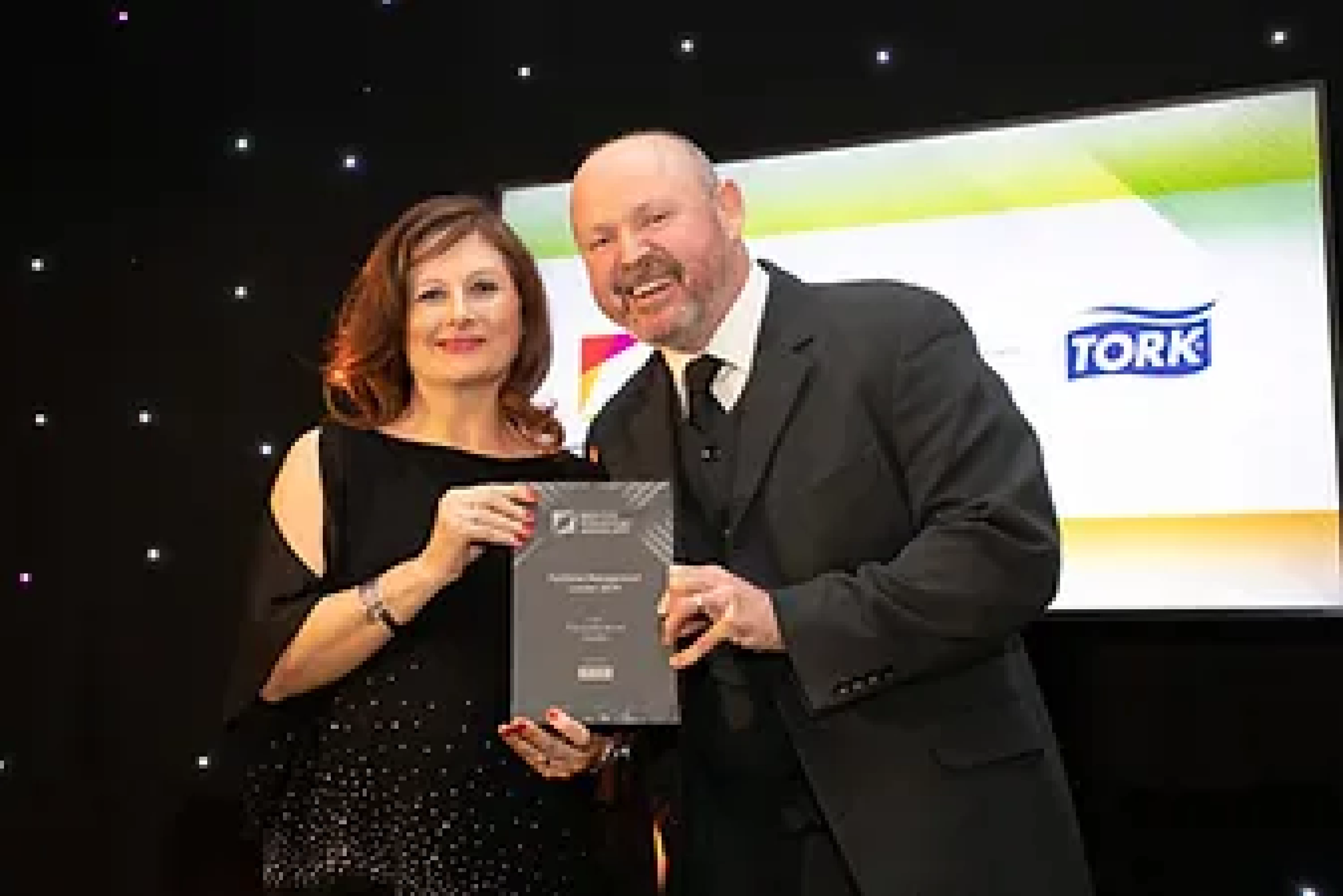 David Norton, Key Account Manager, Tork® an Essity brand, presents the Overall Excellence in Facilities Management award to the CBRE Team.
