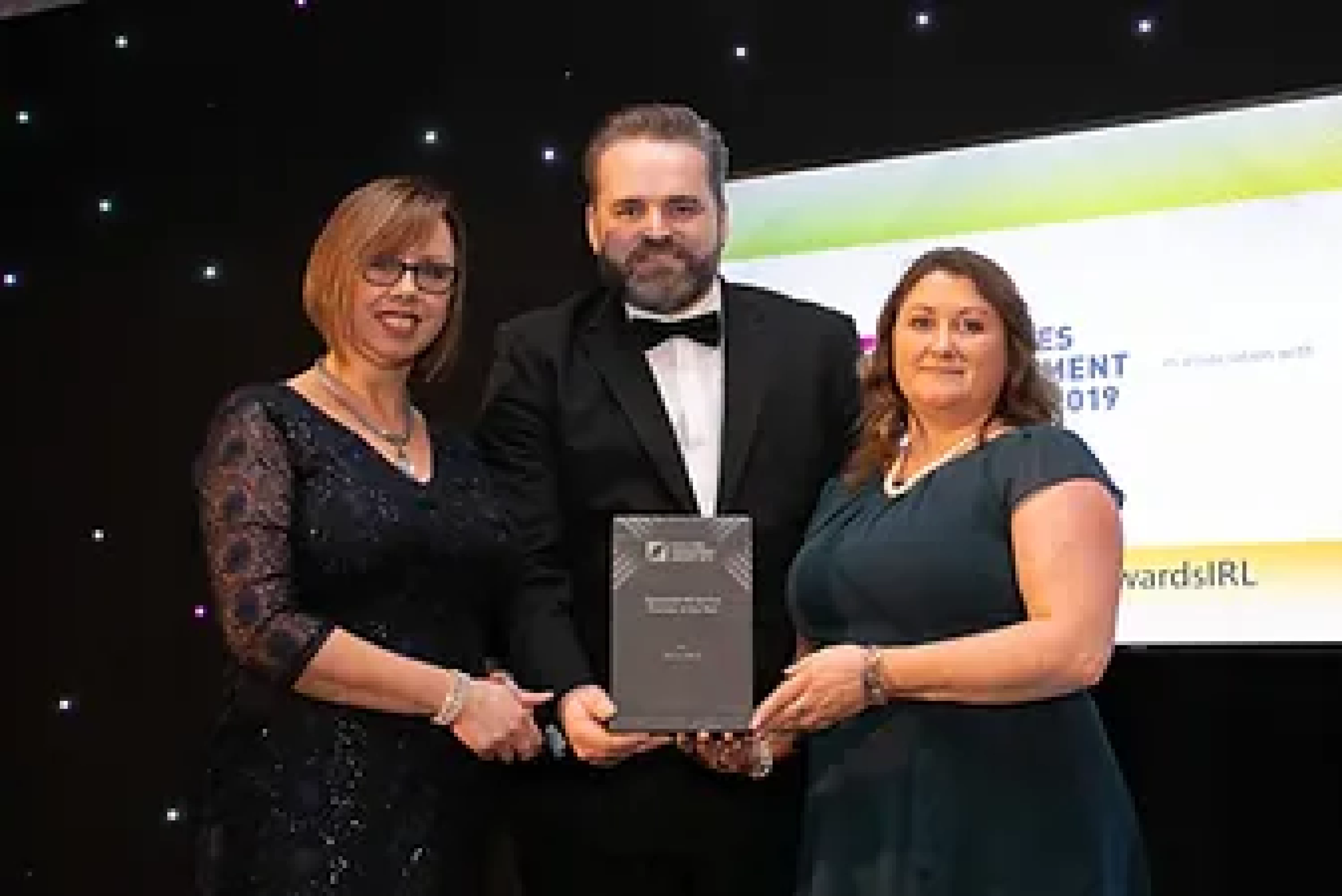 Aine Mulcahy, Managing Director, OCS Group Ireland presents the Best People Development in Facilities Management award to Alana Wilksch & Alan Sweeney, CBRE.